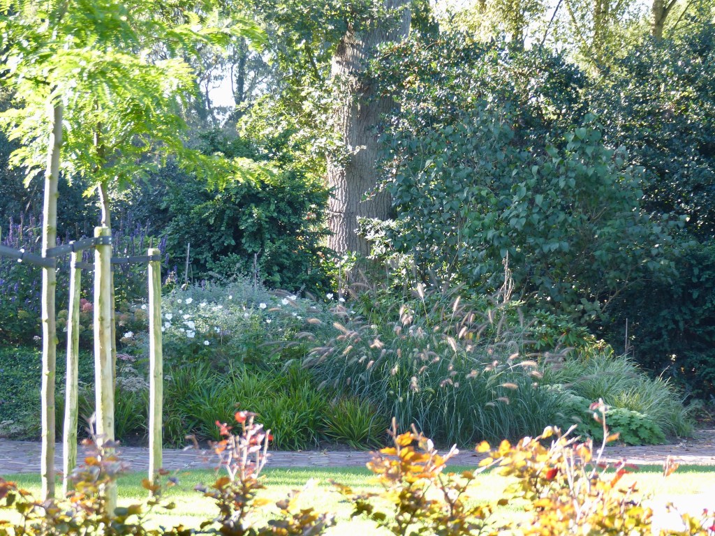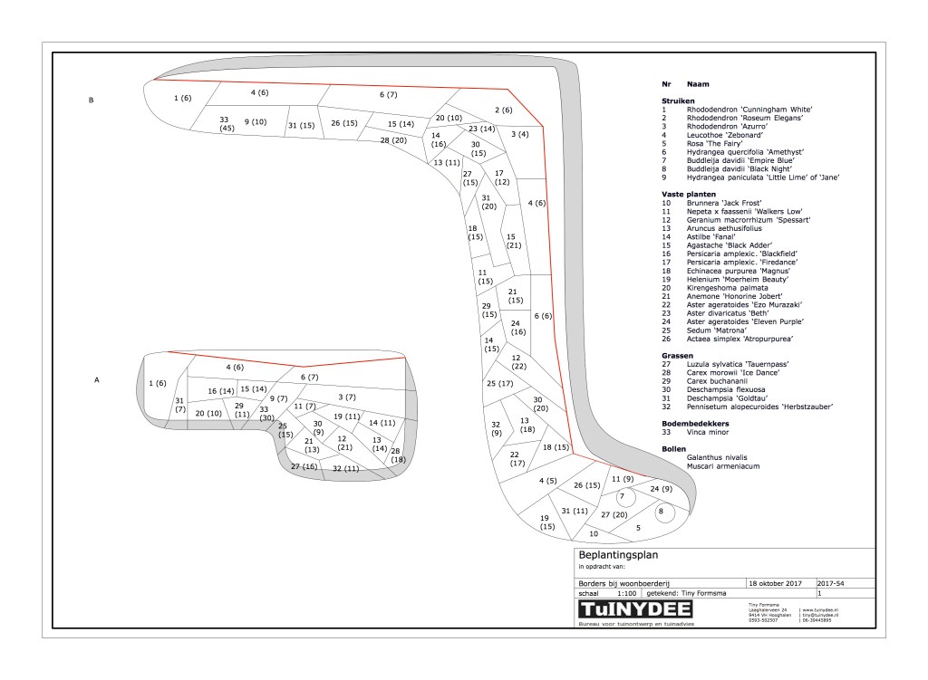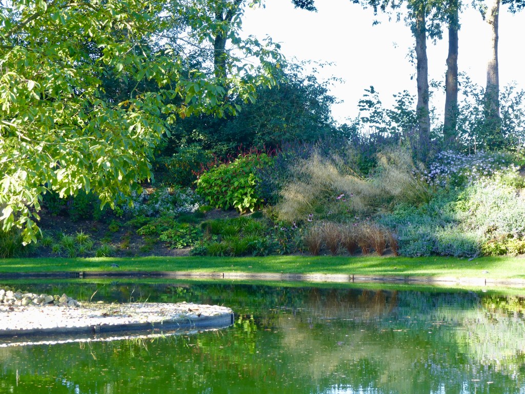 Rond een grote zwemvijver bij een woonboerderij in landelijk gebied, mocht ik de beplanting ontwerpen. De wens was veel kleur en het hele jaar een mooi uitzicht op de border, die deels op een verhoogd talud ligt.