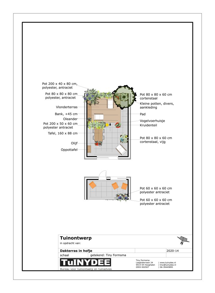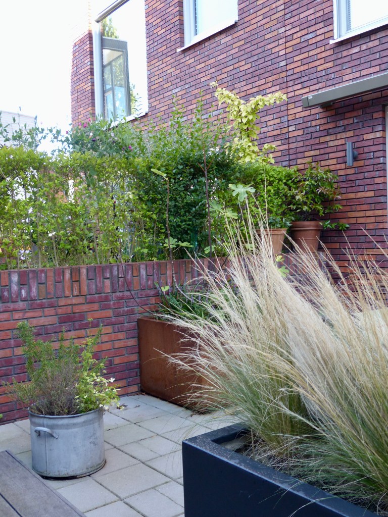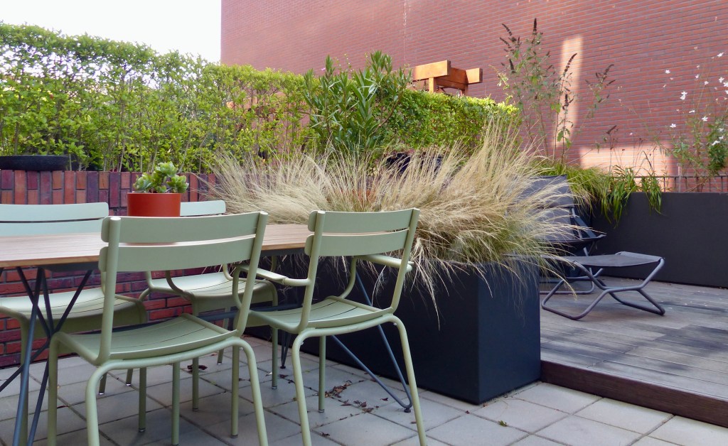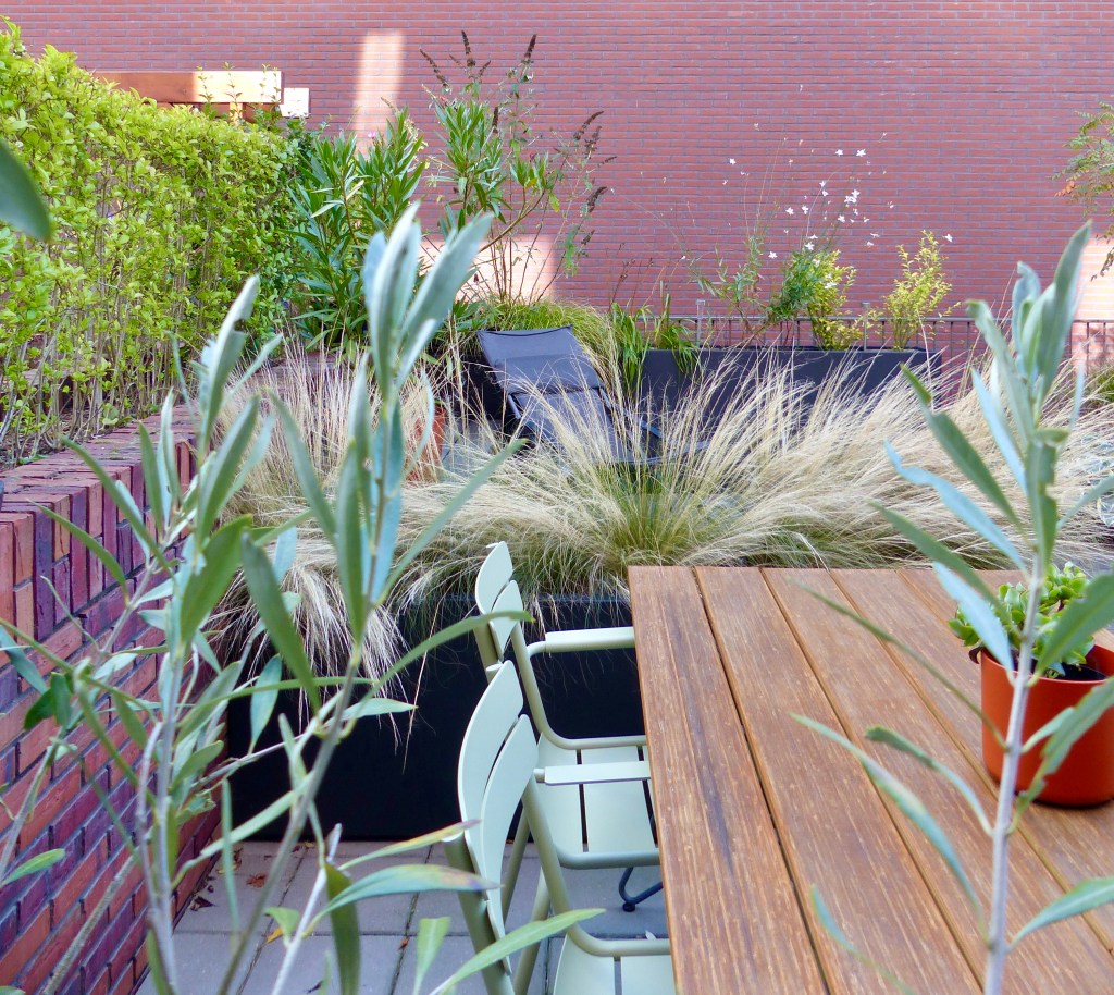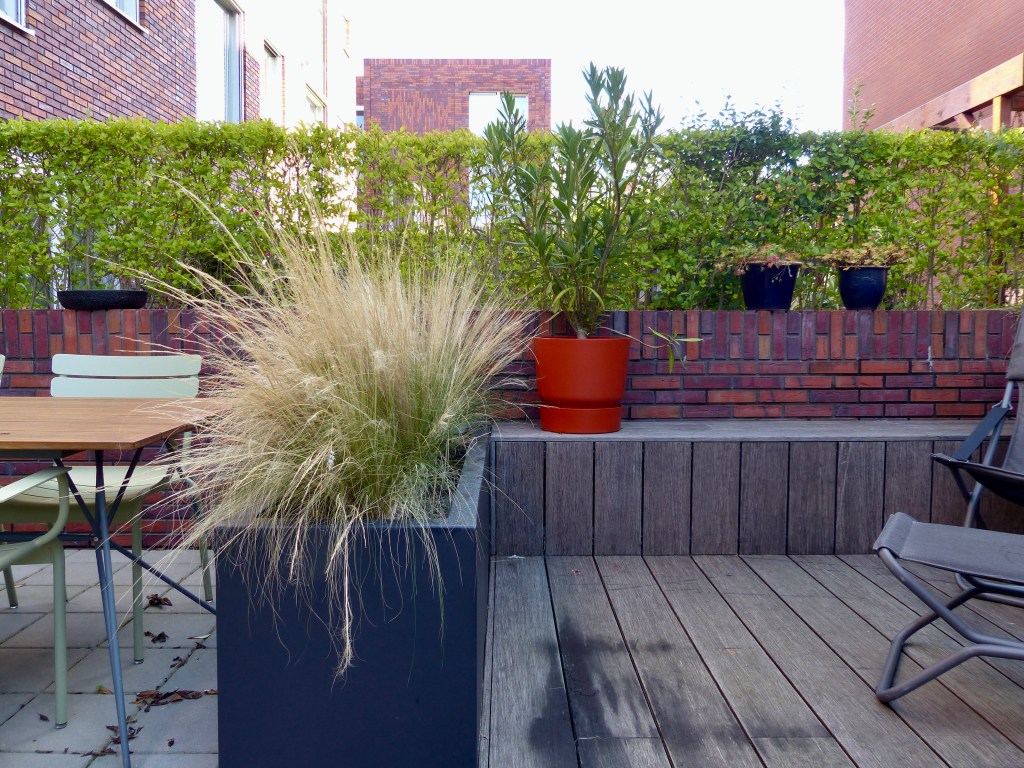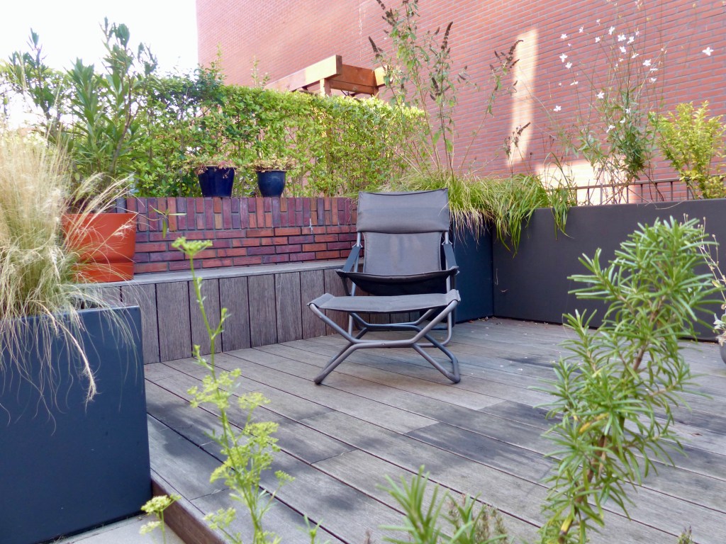 Tussen hoge muren ligt dit verscholen dakterras. Een prettige plek in het centrum, waar fijn privé kan worden gezeten. Door de indeling van de grote bloembakken ontstaan twee ruimtes en lijkt het terras groter. De vaste bank creëert veel zitplekken.