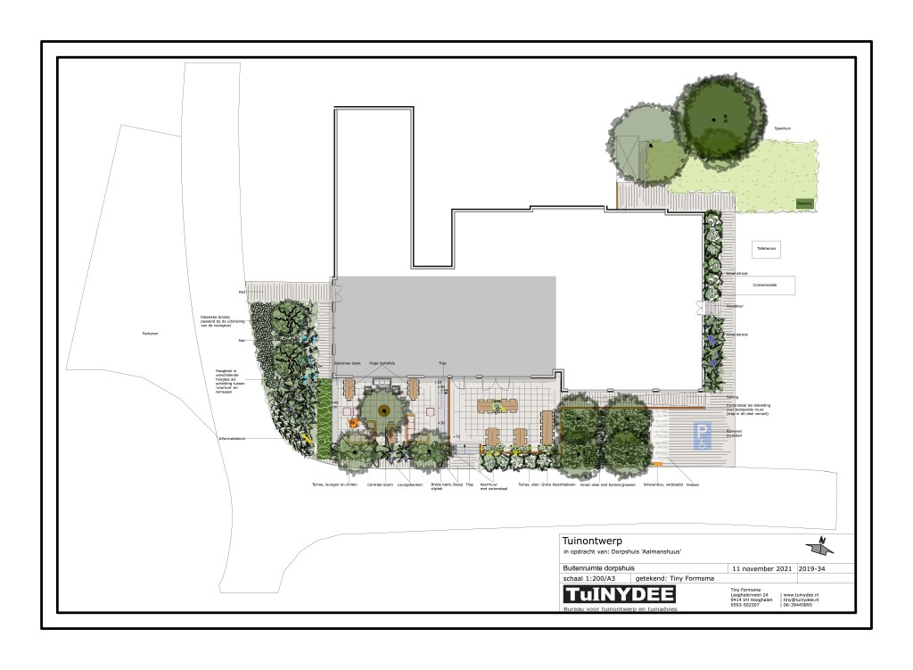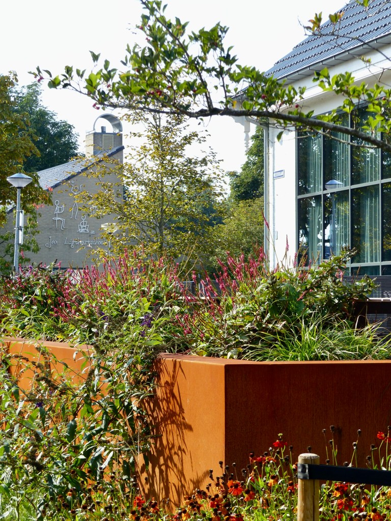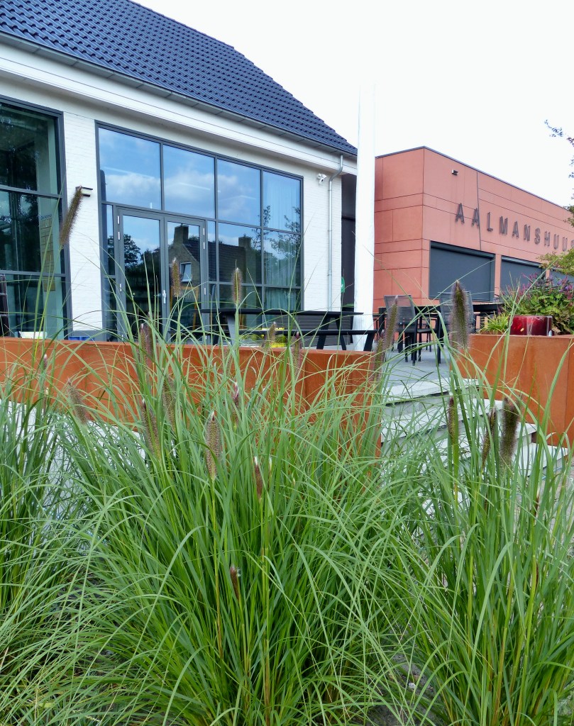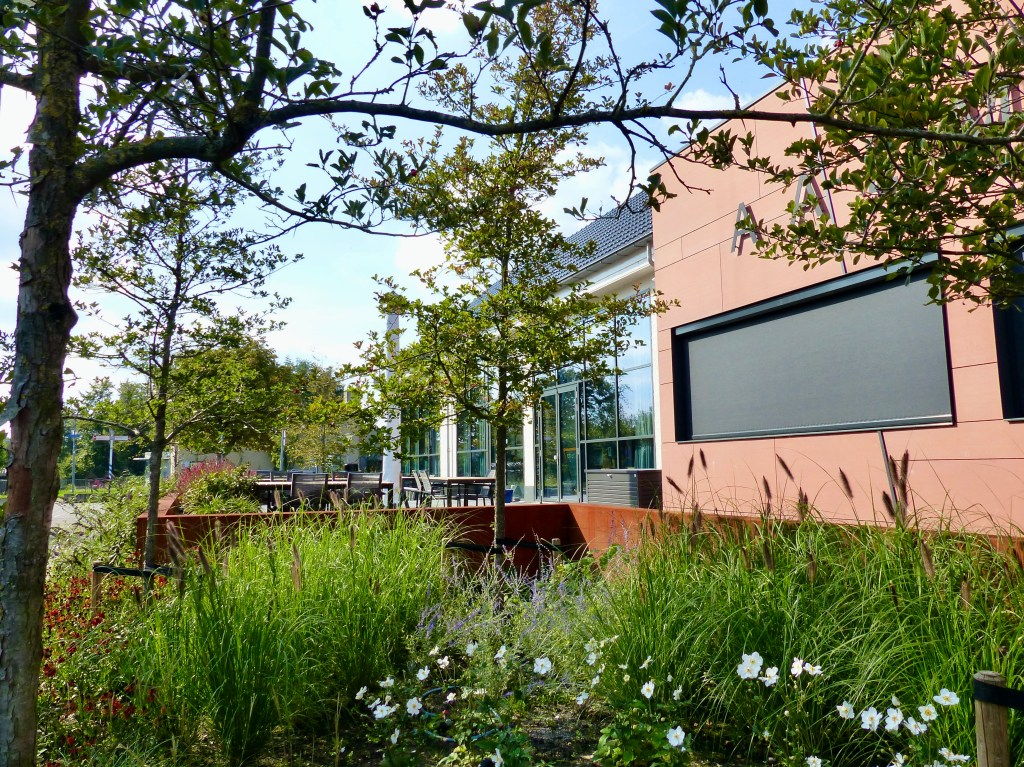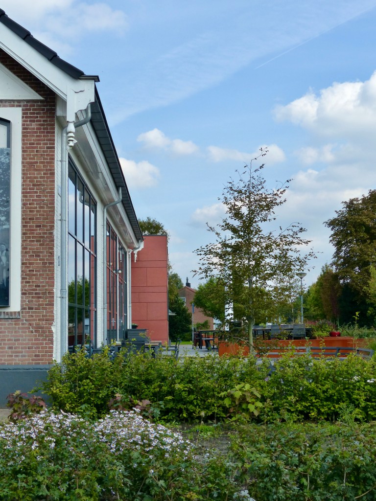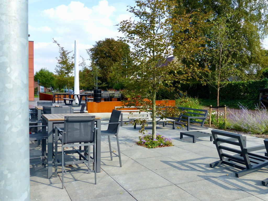 Bij het verbouwde dorpshuis van Westerbroek benadrukken de gebruikte materialen en de beplanting de uitstraling van het gebouw. En je kunt heerlijk met veel mensen op de terrassen zitten!