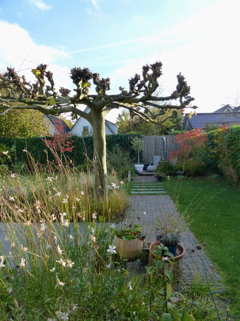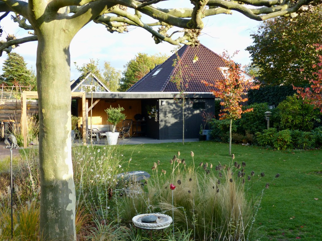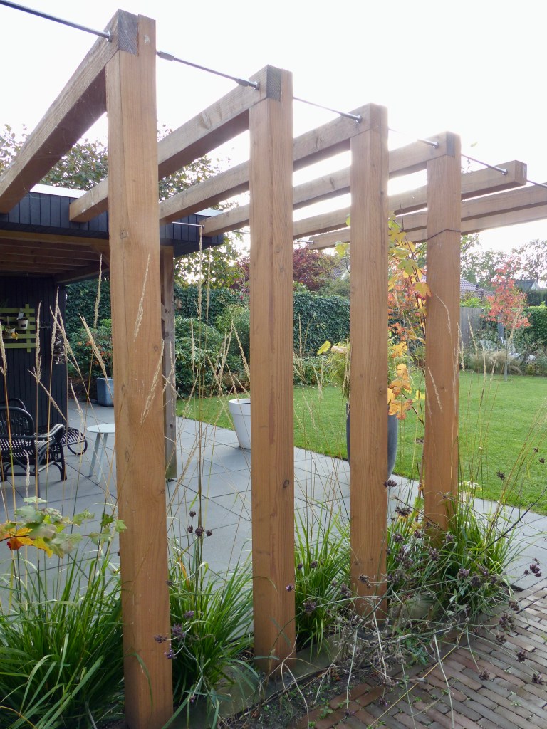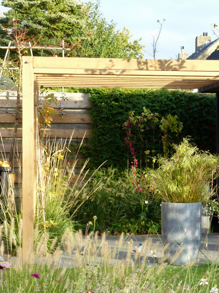 De tuin had een nieuwe impuls nodig, qua indeling en qua beplanting. Omdat de overkapping niet meer bij de nieuwe uitstraling paste is deze met nieuw hout bekleed en aangevuld met een bijzondere pergola. De nieuwe bomen geven schaduw in deze zonnige achtertuin.